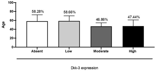 Our data highlighted that a low expression of DKK3 was more frequent in male patients, while in female patients, a higher expression of DKK3 was more frequent (Figure 3). In our research, we observed a significant correlation between an increase in age and absent or lower DKK3 expression, observing absent or lower expression of DKK3 in patients with an average age of 57 years (Figure 4).