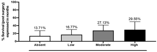 The analysis between DKK3 expression and overall survival after the first surgery for GB did not show a statistically significant correlation, although an increase in survival was observed in patients with moderate and high DKK3 expression (28 months) compared to a median of 15 months of survival in patients with lower or absent expression of DKK3 (Figure 5).