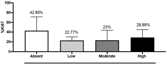 The median of the Ki-67 labeling index was lower in patients with moderate (23%) and high expressions of DKK3 (28.8%) compared to 43% in patients with absent expression of DKK3 (Figure 6). Interestingly, we noted that in our cases, 17 cases had Ki-67 levels higher than 25%, 3 cases were >80%, and 7 cases had Ki-67 values >50%; of these latter cases, four cases had a survival >11 months, and two cases showed a survival of 19 months. The three cases that displayed Ki-67 values >80% showed a survival, respectively, of 1 month, (died of cerebral empyema), 23 months, and 18 months.