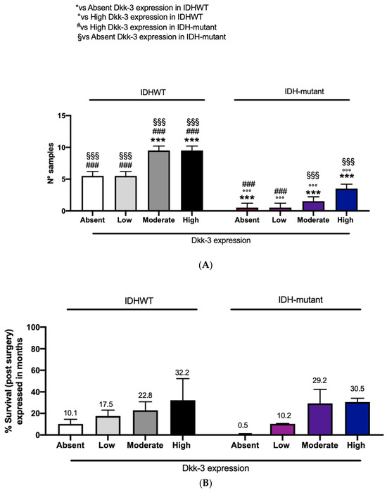 Figure 7. (A). The correlation between DKK3 expression and IDH. Two-Way ANOVA for multiple comparison test. *** p < 0.001 vs. absent DKK3 expression in IDH WT patients; °°° p < 0.001 vs. high DKK3 expression in IDH WT patients; ### p < 0.001 vs. high DKK3 expression in IDH-mutant patients; §§§ p < 0.001 vs. absent DKK3 expression in IDH-mutant patients. (B). The correlation between DKK3 expression, IDH, and survival. Two-Way ANOVA for multiple comparison test. Row Factor = 108; F value (5, 33) = 0.450; p value = 0.70; Column Factor = 446; F value (7, 33) = 1.85; p value = 0.11.