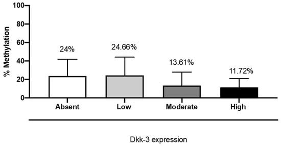 Patients with moderate and high expressions of DKK3 showed a significant reduction in the percent of methylation (11.9%) of the MGMT gene compared to patients with absent or low DKK3 expression (26.3% and 26.8%, respectively) (Figure 8).