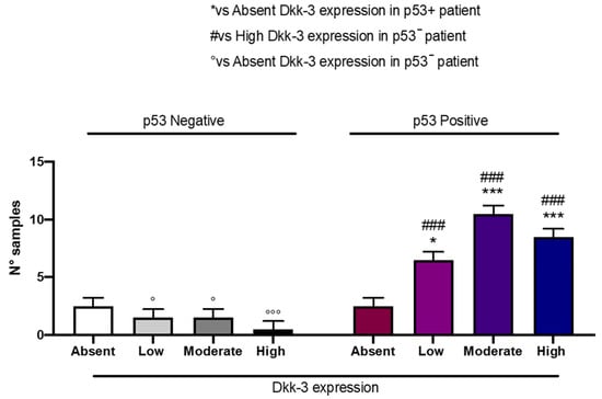 Figure 9. The correlation between DKK3 expression and p53 expression. Two-Way ANOVA for multiple comparison test. * p < 0.05 and *** p < 0.001 vs. absent DKK3 in p53-Positive patients; ### p < 0.001 vs. high DKK3 expression in p53-Negative patients; ° p < 0.05 and °°° p < 0.001 vs. absent DKK3 expression in p53-Negative patients.