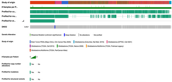 cBioPortal (https://www.cbioportal.org/ accessed on 16 April 2021) is a free database for exploring, evaluating, and analyzing multidimensional cancer genomics data [22]. This database enables large-scale data processing, statistical analysis, and graphical review of tumor variations from gene to protein level. The portal contains datasets of a large number of cancer studies, including Cancer Cell Line Encyclopedia (CCLE) and Cancer Genome Atlas (TCGA, https://www.cancer.gov/tcga, accessed on 16 April 2021). We also based this research on information generated by the TCGA research network [19,22]. The research was carried out, as a virtual study, by using a combination of data, querying 2241 samples from 2220 GB patients’ cases. All cBioPortal data had the same clinical criteria and equally managed and normalized data, allowing comparative analyses of samples between different studies. We utilized the OQL programming language (Onco Query Language), and interrogated for the DKK3 gene and the parameters selected for our analysis. In detail, the correlations were performed between the DKK3 gene in GB samples and sex, age, survival, and IDH and MGTMT status. Data obtained from cBioPortal database do not require ethical approval. All patients whose samples were used in this analysis signed informed consent.