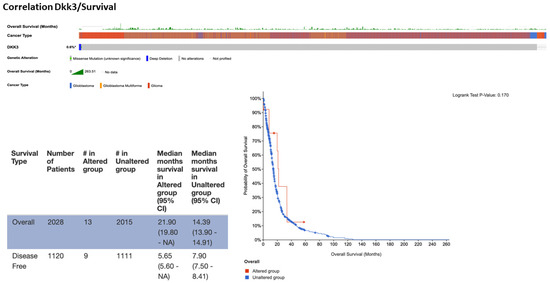 The correlations were performed using cBioportal for cancer genomics, querying 2241 samples from 2220 GB patients’ cases (Figure 10). The analysis performed showed a prevalence of pathology with 1152 cases registered in men compared to women (740), supporting our clinical data that a low expression of DKK3 tends to be higher in male patients compared to female patients. In detail, the data obtained were systematized as a function of patient and gene, and the portal’s fundamental construct is the concept of altered genes; specifically, the analysis classifies a gene as altered in a specific patient if it is mutated, homozygously deleted, amplified, or if its relative mRNA expression is less than or greater than a user-defined threshold. In light of these observations, a range of incidence from 10 to 89 years was evidenced, with an increase in frequency from 30 years in patients with unaltered DKK3. Interestingly, in patients with mutated DKK3 (altered group), the incidence age ranged from 25 to 80 years, suggesting an involvement of DKK3 in postponing disease onset. The performed analysis showed an alteration of DKK3 in only 13 patients, compared to 2015 patients which presented an unaltered (not mutated) DKK3 gene. Interestingly, the median months of survival in the altered DKK3 group was higher (21.9 months) compared to 14.9 months of survival observed in patients with unaltered DKK3, suggesting a protective effect of DKK3 on survival (Figure 11). A statistical analysis was performed using the log-rank test as a hypothesis test to compare the survival distributions of samples. It is a nonparametric test and appropriate to use when the data are right-skewed and censored. In GB, IDH1 R132H occurs at the active site of the enzyme and at the highly conserved codon 132 and causes Arg to His substitution. The analysis performed on 2220 patients highlighted IDH1 mutations in the mutated-DKK3-gene group (altered group). Specifically, 12% of the samples showed R132H mutations. In fact, R132C and R132G IDH1 mutation results appeared less common. Particularly, this analysis highlighted 50% of R132G mutations in GB patients compared to IDH1-wild-type observed in the group without DKK3 mutations. The analysis performed on 2220 patients revealed an increase MGMT methylation in the mutated DKK3 group (23%) compared to 8% of methylation status in the group without DKK3 mutations. Statistical analysis of cBioPortal data was performed using the Kruskal–Wallis test as nonparametric equivalent to the ANOVA test.