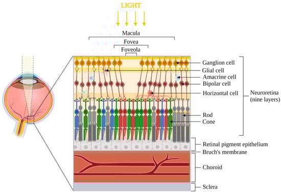 - Behar-Cohen, F.; Gelizé, E.; Jonet, L.; Lassiaz, P. Anatomy of the retina. Med. Sci. 2020, 36, 594–599. [Google Scholar]