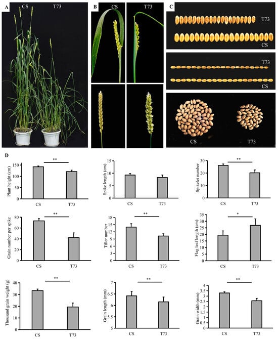 Phenotypic characterization of T73 mutant plants. (A) CS and T73 plants grown in a field environment. (B) Spike morphology of CS and T73. (C) Seeds of CS and T73. (D) Statistics of plant height, spike length, spikelet number, grain number per spike, tiller number, flag leaf length, thousand grain weight, grain length, and grain width of CS and T73. The values for grain length and grain width were an average of 50 grains. * p < 0.05; ** p < 0.01.