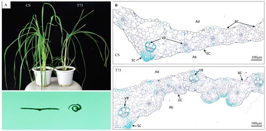 Phenotype changes of CS and T73 leaves. (A) Plant stature (top) and transverse leaf sections (bottom) of CS and T73. (B) Toluidine blue-stained cross sections of CS and T73 leaves. BC, bulliform cell; VB, vascular bundles; SC, sclerenchyma cells; EC, epidermal cell; Ad, adaxial; and Ab, abaxial.