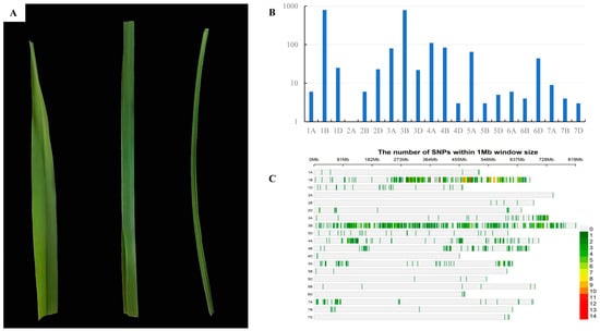 To map the potential loci modulating the rolled-leaf phenotype, 20 wild-type and 20 mutant individuals from the F2 population of T73 × AK58 were collected to construct W-bulk and M-bulk, respectively. The total genome DNA of the parents and bulks was extracted using a plant genomic DNA kit (Tiangen Biotech, Beijing, China). DNA purity and integrity were assessed and confirmed. Chip-based genotyping was carried out using the Wheat55K SNP array containing 53,063 markers by China Golden Marker (Beijing) Biotech Co. Ltd. (Beijing, China). The monomorphic, heterozygous, and low-quality SNPs with ambiguous SNP signals were filtered out. Markers showed homozygous genotypes among T73, AK57, and M-bulk were retained, and a graph of the enrichment of SNPs on the whole genome was plotted using a sliding widow of 1 Mb.