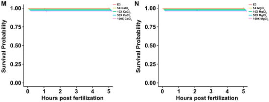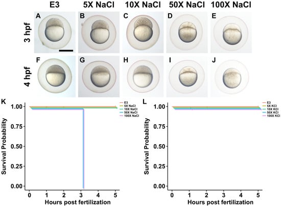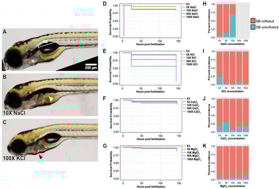 Data were gathered on how well zebrafish were able to survive in different concentrations of different salts from the blastocyst to larval stage (see Supplemental Table S1 for treatments and age groups). As shown in Figure 1, the treatments with CaCl2 and MgCl2 had no effect on survival (p = 0.9 and p = 0.8, respectively) (Figure 1F,G), even when the concentration was as high as 100× the natural concentration. When the zebrafish were treated with KCl at higher concentrations such as 50× and 100×, late survival was substantially affected (p < 0.05) (Figure 1E). However, this is likely due to the fact that high concentrations of KCl impair cardiac conductivity, leading to arrhythmia and cardiac arrest; the zebrafish in fact does not require active circulation for gas exchange until later in development []. The most drastic effect on survival was seen with NaCl, where at 50× and 100× the natural concentration, zebrafish did not survive, whereas survival was not affected at 5× or 10× (p < 2 × 10−16) (Figure 1D).