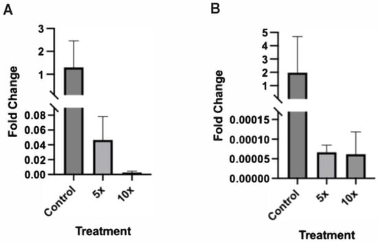 Fold changes (2−∆∆CT) of Shh (A) and Ptc1 (B) across 3 treatments of NaCl concentration (E3, 5×, and 10×). For both genes, gene expression in both 5× and 10× natural salinity were significantly lower than expression in control.