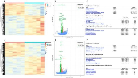 A functional enrichment analysis was performed to determine Gene Ontology (GO), and it revealed that differentially expressed genes in the 5× NaCl group were mainly in the spliceosome cycle, ATM signaling (DNA damage response), sirtuin signaling, and kinetochore metaphase signaling (Figure 4C). Similarly, the 10× NaCl group affected ATM signaling, kinetochore metaphase signaling, and microRNA biogenesis (Figure 4F). When Physiological System Development and Function was assessed, both concentrations affected embryo development and organismal development (Figure 4C,F).