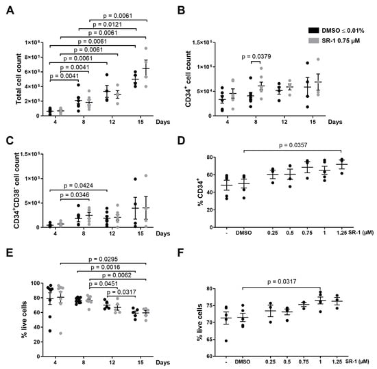 Expansion of CD34+ cells by cytokines and StemRegenin 1. 104 CD34+ cells were cultured in the presence of cytokines (100 ng/mL thrombopoietin (TPO), stem cell factor (SCF), FMS-like tyrosine kinase 3 ligand (FLT3L), and interleukin-6 (IL-6)) and treated with StemRegenin 1 (SR-1) at the indicated concentrations or DMSO 0.01% (control). Cells were counted and analyzed by flow cytometry at the indicated time points. The amount of live cells was determined by staining with 7-AAD and Annexin V. (A): Total cell count. (B): CD34+ cell count. (C): CD34+CD38− cell count. (D): % CD34+ was determined on day 4 of culture. (E): % of live cells. (F): % of live cells on day 8 of culture. Bars represent means of n = 4–7 from 6 independent experiments ± SEM for (A–C), means of n = 3–5 from 4 independent experiments ± SEM for (D,F), and means of n = 5–8 from 7 independent experiments ± SEM for (E). Significant p values are indicated (Mann–Whitney Test).