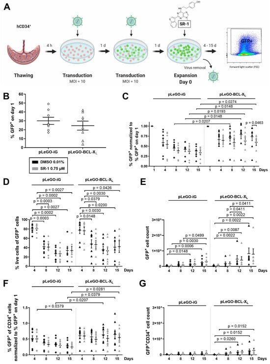 BCL-XL overexpressing CD34+ cells accumulate in vitro. (A) Experimental design of the combination of ex vivo stem cell expansion culture with lentiviral BCL-XL overexpression. 104 CD34+ cells were transduced twice with pLeGO-iG (control), pLeGO-BCL-XL lentivirus (MOI = 10), or remained untreated. Subsequently, the cells were cultured in the presence of cytokines (100 ng/mL TPO, SCF, FLT3L, and IL-6) and treated with 0.75 µM SR-1 or DMSO 0.01% (control). Cells were counted and analyzed by flow cytometry at the indicated time points. Experiments with <10% GFP+ on day 1 were excluded from the analyses of absolute cell counts (E,G). (B) The transduction efficiency was determined by flow cytometry on day 1. (C) % GFP+ at the indicated time points was normalized to % GFP+ on day 1. (D) % of live cells of the GFP+ population was determined by staining with 7-AAD and Annexin V. (E) GFP+ cell count. (F) % GFP+ of CD34+ cells at the indicated time points was normalized to % GFP+ on day 1. (G) GFP+ CD34+ cell count. Bars represent means of n = 8 from 8 independent experiments ± SEM for (B,C,F), means of n = 6–8 from 8 independent experiments ± SEM for (D), and means of n = 8 for pLeGO-iG and n = 6 for pLeGO-BCL-XL from 8 independent experiments ± SEM for (E,G). Significant p values are indicated (Mann–Whitney Test).