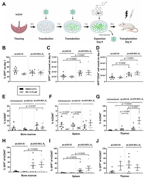 Cells expanded in the presence of BCL-XL overexpression have a survival advantage in vivo. (A) Experimental design of xenotransplantation experiment. 105 CD34+ cells were transduced twice with pLeGO-iG (control) or pLeGO-BCL-XL lentivirus (MOI = 10). Subsequently, the cells were cultured in the presence of cytokines (100 ng/mL TPO, SCF, FLT3L, and IL-6) and treated with 0.75 µM SR-1 or DMSO 0.01% (control). The transduction efficiency was determined by flow cytometry on day 1. The progeny of 1 × 105 CD34+ cells were counted and analyzed by flow cytometry on day 8 of culture prior to transplantation. (Figure 3B–D) (B) % GFP+ on day 1. (C) GFP+ cell count on day 8. (D) GFP+ CD34+ cell count on day 8. On day 8 of culture, 9 × 105 expanded cells were transplanted retro-orbitally into sublethally irradiated Rag2−/−γc−/− mice. Eight weeks after transplantation, recipient mice were sacrificed and single cell suspensions of their hematopoietic and lymphatic organs were analyzed by flow cytometry. (Figure 3E–J) (E) Total human engraftment in bone marrow. (F) Total human engraftment in spleen. (G) Total human engraftment in thymus. (H) % GFP+ cells of human CD45+ cells in bone marrow. (I) % GFP+ cells of human CD45+ cells in spleen. (J) % GFP+ cells of human CD45+ cells in thymus. Bars represent means of n = 4–7 from 8 independent experiments for (B–D), means of n = 3–7 from 8 independent experiments ± SEM for (E–G), and means of n = 4–7 from 8 independent experiments ± SEM for (H–J). Significant p values are indicated (Mann–Whitney Test).
