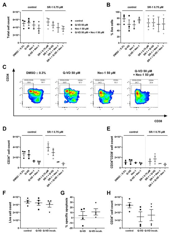 Caspase and necroptosis inhibition are not beneficial for ex vivo expansion. 104 CD34+ cells were cultured in the presence of cytokines (100 ng/mL TPO, SCF, FLT3L, and IL-6) and treated with 50 µM Q-VD-OPh (Q-VD) or 50 µM Necrostatin-1 (Nec-1) and 0.75 µM SR-1 or DMSO ≤ 0.3%. Cells were counted and analyzed by flow cytometry on day 4 of culture. (Figure 4A–E) (A) Total cell count. (B) % live cells. (C) Representative FACS plots of CD34 and CD38 expression on day 4. (D) CD34+ cell count. (E) CD34+CD38− cell count. 5 × 104 freshly purified CD34+ cells were frozen according to the normal freezing protocol (control), treated with 50 μM Q-VD added directly to the freezing medium, or incubated for 30 min with 50 μM Q-VD before additionally being treated with 50 μM Q-VD added directly to the freezing medium (Q-VD incub.). After 5 to 12 months in liquid nitrogen at −196 °C, the cells were thawed according to the normal protocol, counted, and flow cytometric analysis was performed. (Figure 4F–H) (F) Live cell count. (G) Specific apoptosis compared to the normal freezing protocol. (H) CD34+ cell count. Bars represent means of n = 2–3 from 3 independent experiments ± SEM for (A−E) and means of n = 4 from 4 independent experiments ± SEM for (F–H). Significant p values are indicated (Mann–Whitney Test).