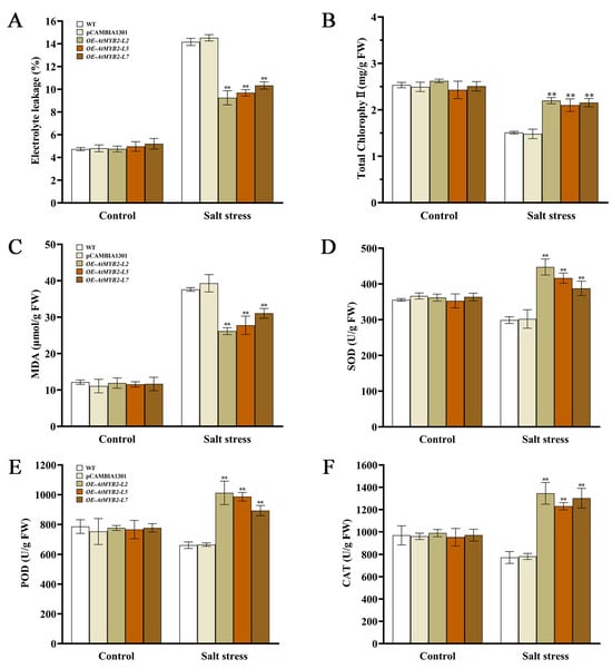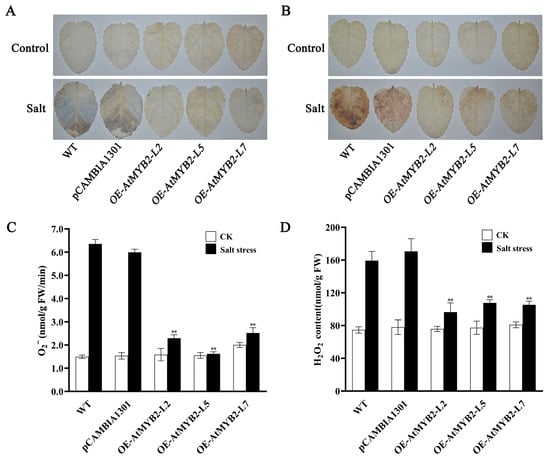 2.3. AtMYB2 Reduces ROS Accumulation under Salt Stress