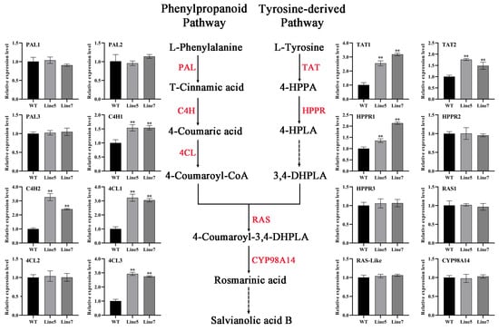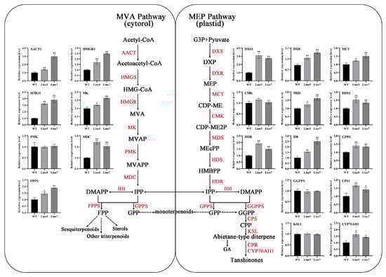 3.2. AtMYB2 Promotes Tanshinones and Salvianolic Acid Content by Upregulating the Expression of Biosynthesis Genes