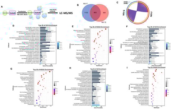 Bioinformatics analysis. (A) Flow chart of turboID proximity. (B) Venn diagram. A Venn diagram was used to describe the number of high-confidence host proteins screened by a proximity interactome assay. (C) The purple part represents the overlapping host protein associated with NiV F and G proteins. (D) GO enrichment analysis. The histogram is used to depict the GO functional attributes of the 1996 high-confidence host proteins that interact with NiV F protein. (E) KEGG enrichment analysis. The histogram is used to depict the KEGG functional attributes of the top 25 KEGG pathways of 1996 high-confidence host proteins that interact with NiV F protein. (F) GO enrichment analysis. The histogram is used to depict the GO functional attributes of the 1524 high-confidence host proteins that interact with NiV G protein. (G) KEGG enrichment analysis. The histogram is used to depict the KEGG functional attributes of the top 25 KEGG pathways of 1524 high-confidence host proteins that interact with NiV G protein. (H) GO enrichment analysis. The histogram is used to depict the GO functional attributes of the 863 overlapping host proteins that interact with both NiV F and G proteins. (I) KEGG enrichment analysis. The histogram is used to depict the KEGG functional attributes of the top 25 KEGG pathway of 863 high-confidence host proteins that interact with both NiV F and G proteins.