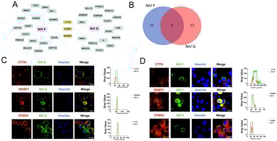Analysis and identification of CTTN, SERBP1, and STMN1. (A) Visualization of top 20 interacting proteins. (B) Venn diagram. The Venn diagram depicts the number of overlapping host proteins with top 20 high-confidence proteins that interact with NiV F and G proteins. (C,D) Colocalization analysis. Myc-tag antibody, CTTN-, SERBP1-, and STMN1-specific antibodies were used as primary antibodies, FITC-anti-mouse and Cy3-anti-rabbit were used as secondary antibodies, Hoechst was applied for nuclear staining, and ImageJ software (ImageJ 1.53e, Java 1.8.0_172) was applied to analyze colocalization of CTTN, SERBP1, STMN1 with NiV F protein or NiV G protein according to the images taken by a confocal microscopy.