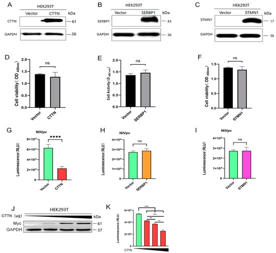Overexpression of CTTN can inhibit NiVpv-infected cells in a dose-dependent manner. (A–C) Western blot assay. Western blots were conducted using anti-myc, anti-SERBP1, and anti-STMN1 antibodies as primary antibodies, and anti-mouse IgG or anti-rabbit IgG HRP conjugated antibodies as the secondary antibodies. (D–F) Cell viability analysis. Cell viability analysis was used to detect the effects of CTTN, SERBP1, STMN1 recombinant plasmids, and transfection reagents on cell viability. (G–I) Luciferase assay. Overexpression of CTTN inhibited the infection of NiVpv, while overexpression of SERBP1 and STMN1 had no significant effect on NiVpv infection. ns p > 0.05; **** p < 0.0001 (t-test), n = 4. (J) Western blot assay. Western blots were conducted using an anti-CTTN antibody as the primary antibody and an anti-rabbit IgG HRP conjugated antibody as the secondary antibody. (K) Luciferase assay. ** p ≤ 0.05; *** p ≤ 0.001; **** p ≤ 0.0001 (t-test).