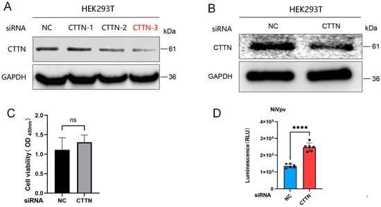 Knockdown of CTTN significantly inhibited NiVpv infection HEK293T cells. (A,B) Western blot assay. Western blots were conducted using an anti-CTTN antibody as the primary antibody and an anti-rabbit IgG HRP conjugated antibody as the secondary antibody. (C) Cell viability assay. The results showed that transfection of siRNA for 24 h had no significant effect on cell viability, ns p > 0.05 (t-test), n = 4. (D) Luciferase assay. Luciferase was used to detect the infection titers of NiVpv. Compared to the siNC group, knockdown CTTN could promote the infection of NiVpv significantly, **** p < 0.0001 (t-test), n = 6.