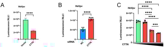 Using the same method as NiVpv (2.3–4), we also examined the effect of CTTN on HeVpv-infected HEK293T cells, and the results showed that overexpression of CTTN could inhibit the HeVpv infection of HEK293T cells significantly (p < 0.0001) (Figure 5A). Knockdown of the expression of CTTN promoted the infection of HeVpv significantly (p < 0.0001) (Figure 5B), and with the increase in CTTN expression, the infection of HeVpv was increasingly inhibited (Figure 5C).