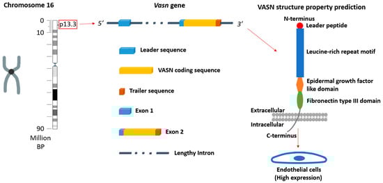 The location of the vasn gene in a human chromosome (chromosome 16), the structural properties of the gene, and a prediction of the VASN protein structure (predicted by RaptorX http://raptorx.uchicago.edu (accessed on 2 April 2024)) [15,16].