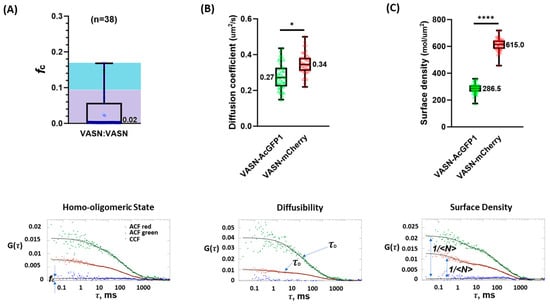 The biophysical characterization of VASN in the cellular membrane including its oligomeric state (* and **** are markers denoting slight and notable statistical significance). (A) The lower panel is a representative set of single-cell PIE-FCCS data. The fraction correlated (fc) can be obtained from the amplitude of the CCF as the CCF is dependent on the distribution of monomers, dimers, trimers, and multimers. The upper panel is VASN’s fc as measured from 38 cells, which clearly established that the vast majority of VASN resided in the membrane in a monomeric state. (B) The mobility of VASN-AcGFP1 and VASN-mCherry, as denoted as the diffusion coefficient in the (upper panel), was computed with the information of the diffusers’ average dwell time available in the measurement curve (lower panel). (C) ACF’s amplitude is an indicator of the average number of diffusers as these two are in an inverse proportional relationship.