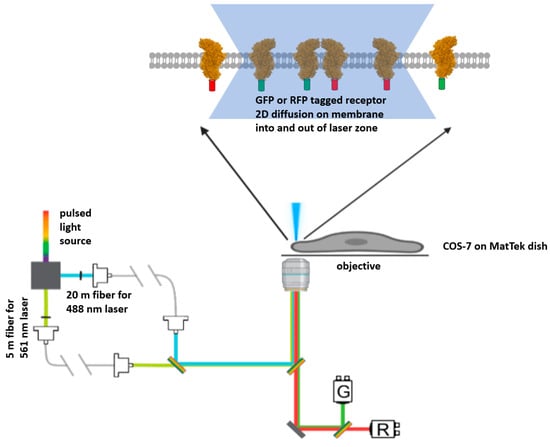 The instrumental set up: Simplified schematic of the PIE-FCCS optical path. A pulsed light source is used to generate two laser beams for excitation. The beams pass through optical fibers with a length difference of 15 m to hard write a 50 ns difference in excitation time. (Note that 50 ns is roughly an order of magnitude longer than AcGFP1 (GFP) and that mCherry (RFP) needs to decay back to the ground state from the excited state.) Fluorescent tagged membrane proteins (a general receptor shown here in this figure) would diffuse into and out of the confocal area under laser excitation, resulting in fluctuations in fluorescence intensity captured by photon counting.