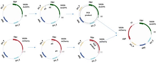 For the exogenous expression of VASN-AcGFP1 and VASN-mCherry, we set out to adopt a novel single-plasmid-based dual protein expression over the conventional dual-expression plasmids. This single plasmid expressing both VASN-AcGFP1 and VASN-mCherry simplifies the transfection procedure and reduces labor. The starting point for the fabrication of the single plasmid for dual expression is with two regular expression plasmids, one for VASN-AcGFP1 and one for VASN-mCherry. For the regular expression plasmid for VASN-AcGFP1, nearly the entirety of the plasmid was amplified out with primer 1 (p1) and primer 2 (p2), including the VASN-AcGFP1 gene and all the regulatory and survival components, e.g., enhancer and antibiotic resistance gene. For the other regular expression plasmid for VASN-mCherry, the VASN-mCherry gene together with its regulatory components were amplified out with primer 3 (p3) and primer 4 (p4). The coupled sticky ends were fitted onto the end of the linearized DNA in the PCR process. DNA ligation was carried out to fabricate the single plasmid for the dual expression of VASN-AcGFP1 and VASN-mCherry after DNA cleanup. This procedure is graphically shown in Figure 4.