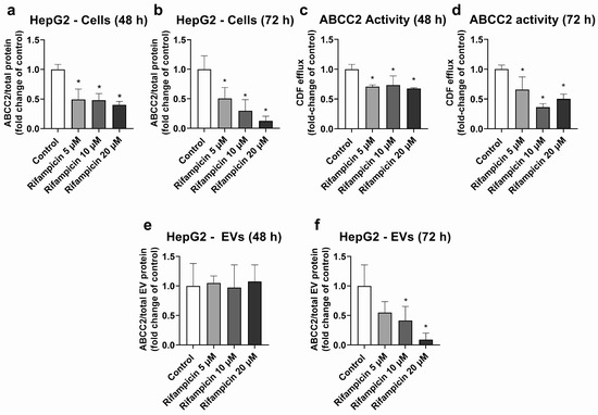 Expression and activity of ABCC2 in HepG2 cells treated with rifampicin (5–20 µM) and their derived EVs. ABCC2 expression was quantified by UPLC-MS/MS in HepG2 cell lysates after treatment with rifampicin for 48 (a) and 72 h (b). ABCC2 activity was determined in HepG2 cells treated with rifampicin for 48 (c) and 72 h (d) by measuring the efflux of dichlorofluorescein (DCF) by spectrofluorometry. ABCC2 expression was determined by UPLC-MS/MS in EVs from cells treated with rifampicin for 48 (e) and 72 h (f). Results (mean ± S.D.) are expressed as fold change in the expression or activity in the control (untreated cells). *: different from control, p < 0.05, n ≥ 3.