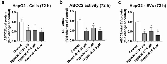 Expression and activity of ABCC2 in HepG2 cells treated with hypericin (0.01–0.5 µM, 72 h) and their derived EVs. ABCC2 expression in HepG2 cell lysates (a) was quantified by UPLC-MS/MS and ABCC2 activity (b) by spectrofluorometry. ABCC2 expression was determined in EVs from cells treated with rifampicin for 72 h by UPLC-MS/MS (c). Results (mean ± S.D.) are expressed as fold change in the expression or activity in the control (untreated cells). *: different from control, p < 0.05, n ≥ 3.