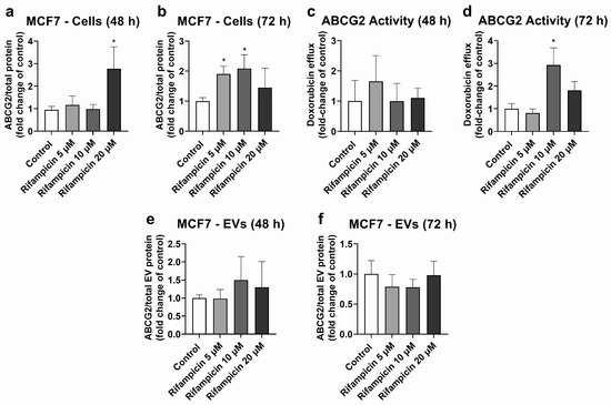 Expression and activity of ABCG2 in MCF7 cells treated with rifampicin (5–20 µM) and their derived EVs. ABCG2 expression was quantified in MCF7 cell lysates after treatment with rifampicin for 48 (a) and 72 h (b) by UPLC-MS/MS. ABCG2 activity was determined in MCF7 cells treated with rifampicin for 48 (c) and 72 h (d) by measuring the efflux of doxorubicin by spectrofluorometry. ABCG2 expression was determined by UPLC-MS/MS in EVs from MCF7 cells treated with rifampicin for 48 (e) and 72 h (f). Results (mean ± S.D.) are expressed as fold change in the expression or activity in the control (untreated cells). *: different from control, p < 0.05, n = 3–6.