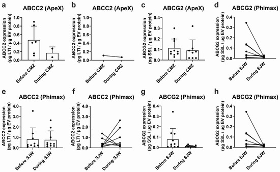 From a total of 13 participants of the Phimax trial, ABCC2 was detected in 9 participants (0.810 ± 1.105 pg LTI/μg EV protein, CV: 136.4%) before initiation of the treatment with SJW, and in 10 participants at the time of completion of the treatment (0.767 ± 0.858 pg LTI/μg EV protein, CV: 111.9%) (Figure 4e). ABCG2 was detected in 10 participants before the treatment (0.078 ± 0.106 pg SSL/μg EV protein, CV: 136.9%) and in 11 participants during the treatment (0.011 ± 0.008 pg SSL/μg EV protein, CV: 77.82%) (Figure 4g). A paired analysis of ABCC2 (Figure 4f) and ABCG2 expression (Figure 4h) before and during treatment did not show any significant differences due to the treatment with SJW. Altogether, our findings confirm the presence of ABCC2 and ABCG2 at the protein level in the plasma EVs of a group of study participants. However, due to the high variability, no significant differences before and after any of the treatments were found.