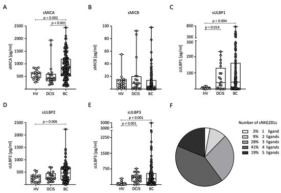Distribution of sNKG2DL serum levels in HVs, DCIS patients, and BC patients. (A–E) Serum levels of sMICA (A), sMICB (B), sULBP1 (C), sULBP2 (D), and sULBP3 (E) were determined through the use of ELISA in the HVs (n = 20), DCIS patients (n = 20), and BC (n = 140) patients. (F) Frequency distribution of BC patients with one or more sNKG2DLs among all sNKG2DL-positive BC patients. sNKG2DL positivity was defined by serum levels above the first quartile.