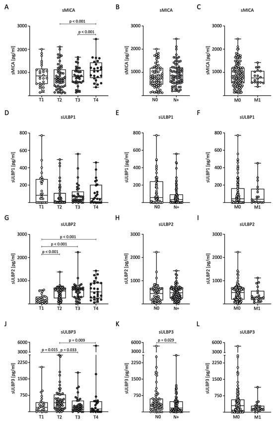 Next, we analyzed sNKG2DL levels in relation to TNM classification in BC patients. For sMICA, significantly higher serum levels were measured in T4 tumors compared to the T2 and T3 stages (Figure 2A). No significant differences were observed for nodal status (N) and distant metastasis (M) (Figure 2B,C). Serum levels of sULBP1 showed no significant differences with respect to TNM stage (Figure 2D–F). For sULBP2, significantly higher serum levels were measured in tumor stages T2, T3, and T4 compared to stage T1 (Figure 2G). As with sMICA, there were no significant differences in nodal status or distant metastases (Figure 2H,I). Serum levels of sULBP3 were significantly higher in patients with stage T2 tumors than in the other stages (Figure 2J). Furthermore, higher levels were observed in lymph node-negative patients (Figure 2K). There were no significant differences in the occurrence of distant metastases (Figure 2L).