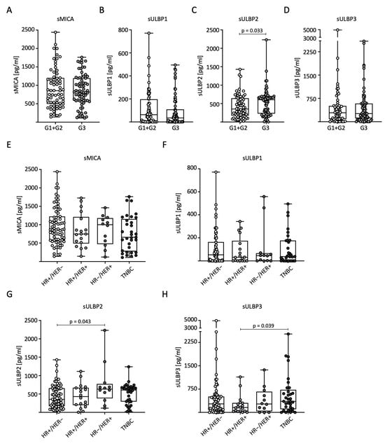 To analyze sNKG2DL distribution in relation to tumor grading (G) according to Elston and Ellis, we divided the patients into low-grade (combined G1 + G2, n = 69) and high-grade (G3, n = 71) tumors for further analysis. Significantly higher serum levels of sULBP2 were observed in G3 than in G1 + G2 (Figure 3C). No significant differences were observed for the other sNKG2DLs (Figure 3A–D). We also examined the correlation between sNKG2DL serum levels, HR status, and HER2 expression. The BC patients were divided into four subtypes: HR+/HER2−, HR+/HER2+, HR−/HER2+, and TNBC. In conclusion, the measured serum levels in general and for sMICA in particular were relatively homogeneously distributed across the different receptor subtypes. For sMICA and sULBP1, no significant difference between the subtypes was observed (Figure 3E,F). For sULBP2, significantly higher serum levels were observed in HR-/HER2+ than in HR+/HER2- tumors (Figure 3G), and for sULBP3, significantly higher serum levels were observed in TNBC than in HR+/HER2+ tumors (Figure 3H).