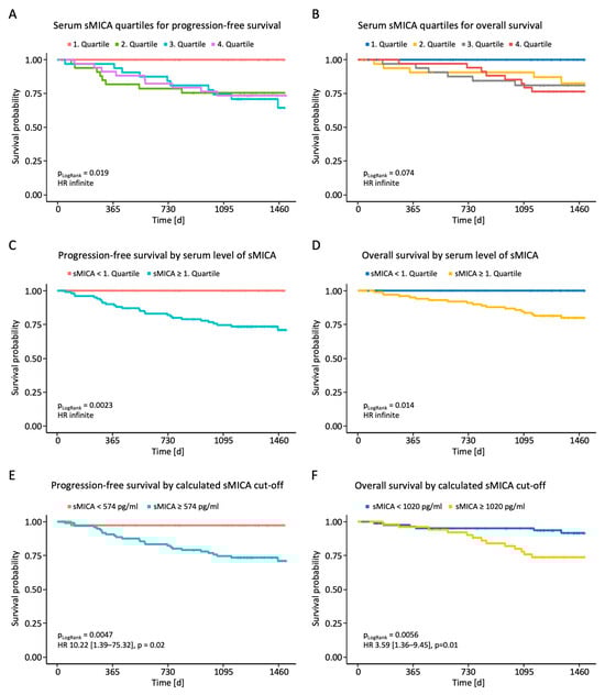 Correlation between sMICA serum levels and PFS and OS in BC patients. Serum levels of sMICA were determined through the use of ELISA in breast cancer patients (n = 140) and correlated with PFS and OS. (A,B) Correlation between sMICA and PFS and OS in BC patients according to quartiles. (C,D) Correlation between sMICA and PFS and OS in BC patients below and above the 1st quartile. (E,F) Correlation between sMICA and PFS and OS in BC patients according to the calculated cut-off values. PFS, progression-free survival; OS, overall survival; %; percent; p, p-value.