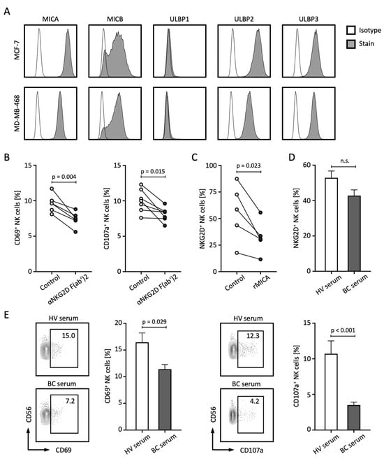 sNLG2DLs impair NK cell function through the downregulation of NKG2D. (A) Surface expression of the indicated NKG2DL was stained with the respective antibody and isotype control and assessed through the use of flow cytometry. (B) PBMCs from HVs (n = 4) were co-cultured with MCF-7 or MDA-MB-468 tumor cells (E:T 4:1) in the presence or absence of anti-NKG2D F(ab’)2 fragments for 4 h and NK cell activation and degranulation was analyzed by CD69 and CD107a expression using flow cytometry, respectively. (C) PBMCs from HVs (n = 5) were co-cultured with soluble rMICA for 48 h and NKG2D expression on NK cells was assessed through the use of flow cytometry. (D) PBMCs from the HV (n = 6) were co-cultured with serum from the HVs (n = 9) or BC patients with high sNKG2DL levels (n = 6) for 24 h and NKG2D expression on NK cells was assessed through the use of flow cytometry. (E) PBMCs from the HVs (n = 6) were co-cultured with MCF-7 or MDA-MB-468 tumor cells (E:T 4:1) with serum from the HVs (n = 9) or BC patients with high sNKG2DL levels (n = 6) for 4 h and NK cell activation and degranulation was analyzed by CD69 and CD107a expression using flow cytometry, respectively. HVs, healthy volunteers; BC, breast cancer; E:T, effector-to-target ratio; %; percent; p, p-value; n.s., not significant.