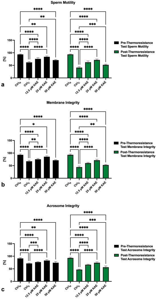 Complementary to an improved post–thaw sperm motility, a significantly increased pre- as well as post-thermoresistance test membrane integrity was observed in experimental groups supplemented with 12.5 µM and 25 μM KAE when compared to CtrlC (p < 0.0001; Figure 1b). In comparison with CtrlN, significant post-thermoresistance test differences were observed in all experimental groups administered with KAE (p < 0.0001).