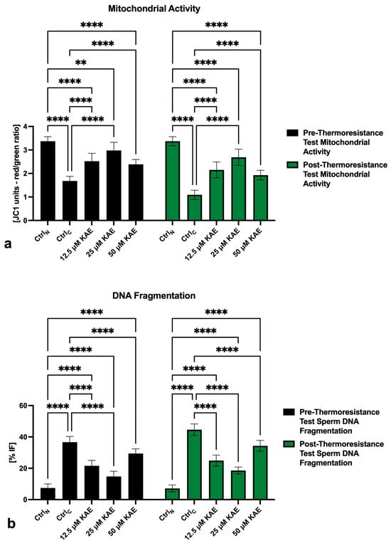 The negative effects of the freeze–thaw process on the sperm mitochondrial activity were unraveled by the JC-1 assay. Significant differences in the post-thermoresistance test mitochondrial membrane potential were detected among CtrlN and CtrlC (p < 0.0001; Figure 2a) as well as CtrlN and all KAE-administered experimental groups (p < 0.0001). On the other hand, a significant improvement of the mitochondrial membrane potential following the thermoresistance test was observed in all experimental groups exposed to KAE when compared to CtrlC (p < 0.0001).