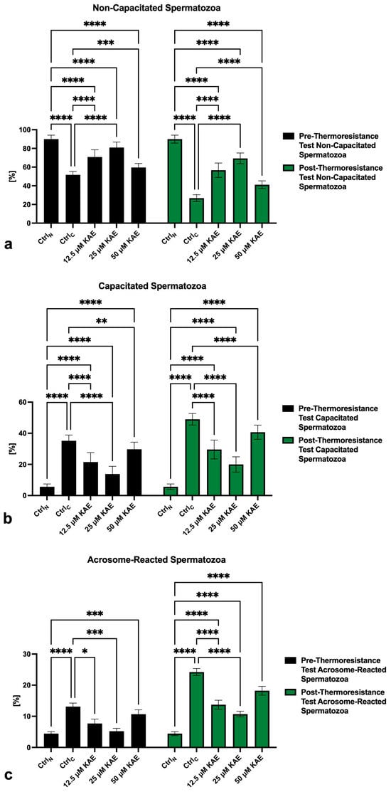 Correspondingly, a significantly increased pre- as well as post-thermoresistance test proportion of “B”-pattern spermatozoa, indicating the onset of capacitation, was observed in CtrlC as well as all KAE-supplemented experimental groups when compared to CtrlN (p < 0.0001; Figure 3b). KAE administration did not fully prevent premature capacitation, as shown by a significantly higher post-thermoresistance test proportion of “B”-pattern spermatozoa in all experimental groups when compared to CtrN (p < 0.0001). Nevertheless, the percentage of capacitated spermatozoa was significantly lower in all KAE-supplemented experimental groups (p < 0.0001) when compared to CtrlC.