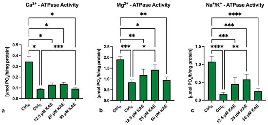 The decline in mitochondrial membrane potential was mirrored by a significantly decreased activity of Ca2+-ATPase (p < 0.05; Figure 4a), Mg2+-ATPase (p < 0.001; Figure 4b) and Na+/K+-ATPase (p < 0.0001; Figure 4c) in CtrlC in comparison to CtrlN. A significant decline in the activity of all three ATP-ases was also observed in all KAE-supplemented experimental groups when compared to CtrlN. Nevertheless, the presence of 25 μM KAE led to significant improvement of Mg2+-ATPase activity in comparison to CtrlC (p < 0.05). Furthermore, significantly higher activity of Na+/K+-ATPase was observed in the case of 25 μM KAE (p < 0.01) when compared to CtrlC.
