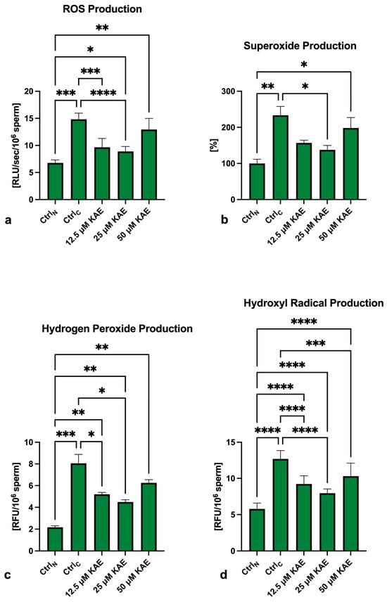 Finally, significantly higher levels of hydroxyl radicals (•OH) were recorded in all cryopreserved groups when compared to CtrlN (p < 0.0001; Figure 5d). While KAE was not able to fully prevent •OH overproduction in the experimental groups, significantly lower •OH levels were recorded in all KAE-supplemented groups (p < 0.0001 with respect to 12.5 µM KAE and 25 µM KAE; p < 0.001 in the case of 50 µM KAE) when compared to CtrlC.