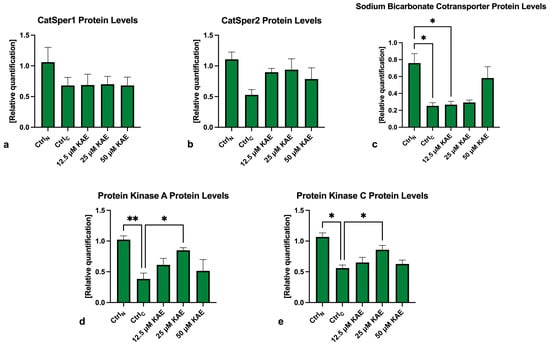 In the case of PKA, significantly lower levels of the protein were observed in the cryopreserved control in comparison to fresh semen (p < 0.01; Figure 6 and Figure 7d). Nevertheless, a significantly higher PKA protein amount was recorded in the experimental group supplemented with 25 μM KAE (p < 0.05) when compared to CtrlC.
