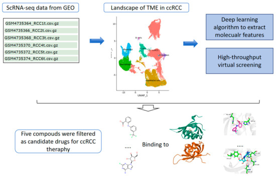 However, there have been several studies applying scRNA-seq analysis to generate transcriptional landscapes of ccRCC and identify tumor-specific regulating key TFs [80,81]. Our study identified the tumor-specific regulatory programs, i.e., the key TFs through the whole landscape of TME in ccRCC tumors. Furthermore, the deep learning algorithms and virtual screening boosted new drug discovery for the therapy of ccRCC and also highlighted one possible direction for medicinal clinical treatment with no necessary pharmacokinetic experiments. Therefore, this study provided a theoretical basis for targeted ccRCC therapy for clinical researchers and the direction of new use of old drugs for ccRCC tumors, therefore greatly improving drug research efficiency.