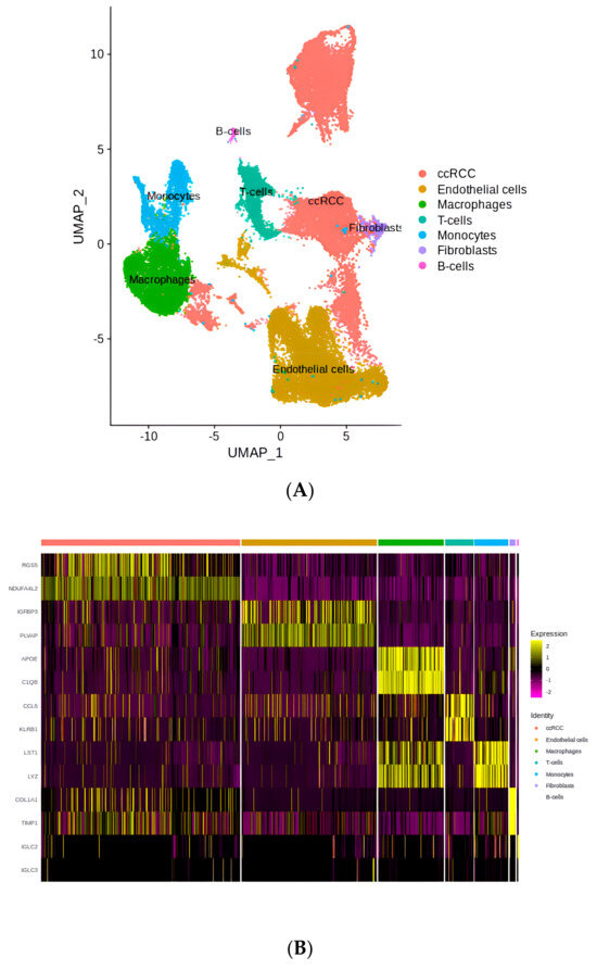 A Seurat object with gene expression data was imported into the Seurat (v2.3.0) R toolkit with the Read 10× function [25]. The normalizeData function in the Seurat package of the R toolkit, version 5.0.1, was used to normalize its raw counts with the command LogNormalize. The cells were visualized through two-dimensional uniform manifold approximation and projection (UMAP) [68]. Cell type annotation was performed using reference-based annotation and the R package “Single R”. After dimension reduction for each dataset, single cells were annotated with known cell types using Single R and reference ccRCC marker genes [69].