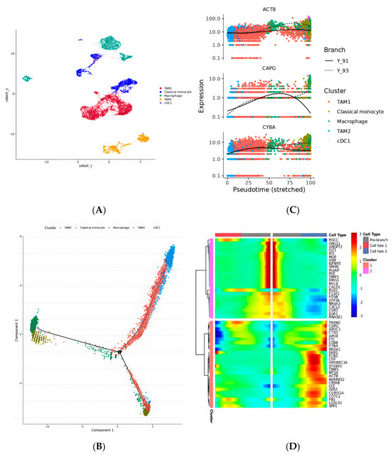 As an important cellular component of innate immunity, macrophages can respond to invading pathogens, phagocytose, and digest pathogens and also participate in the removal of damaged and senescent cells, simulating adaptive immunity through antigen presentation [26]. However, in addition to fighting disease, macrophages are also associated with the occurrence and development of chronic diseases, autoimmune diseases, and tumors. Macrophages that infiltrate tumor tissue or aggregate in solid tumor microenvironments are known as tumor-associated macrophages (TAMs) [27]. In this study, two kinds of TAM subtypes, one classical monocyte cell type and one type of unpolarized macrophage, and a small number of conventional type 1 dendritic cells (cDC1s) were found (Figure 3A). Moreover, the evolutionary trajectory of these clusters was reconstructed from their cell differentiation order (Figure 3B) via Monocle2; most classical monocytes, most macrophages, and the cDC1s were at the early stage of development, while the M1 and M2 TAM subtypes were present and at two differentiation stages. These findings demonstrated that the TAMs in ccRCC tumor cells are differentiated from monocytes. The two phenotypes of TAMs have different “characteristics”; M1 macrophages have high antitumor, antipathogen, phagocytic, and proinflammatory effects, while M2 macrophages play an anti-inflammatory role, participating in tissue remodeling, healing, and promoting tumor growth, and are associated with tumor progression and immunosuppression. The three genes that are most critical to the development of these macrophages’ trajectories are ACTB, CAPG, and STXBP2 (Figure 3C). Subsequently, the top 50 genes involved in developing these subtypes, which varied according to their pseudotime development cluster, were further clustered according to their initial expression patterns and terminal patterns (Figure 3D).