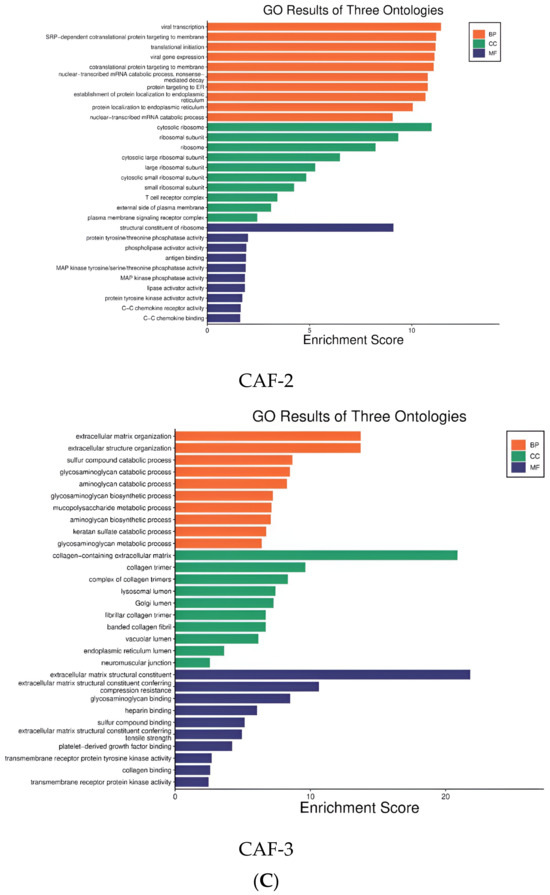 The CAF3 cluster highly expressed the genes Lumican (LUM) and COL1A1 (Figure S3); LUM may regulate collagen fibril organization, circumferential growth, corneal transparency, epithelial cell migration, and tissue repair [35], while COL1A1 provides instructions for making part of a large molecule called type I collagen and is involved in the epithelial–mesenchymal transition. Furthermore, COL1A1 is highly expressed in various cancers and regulates various cellular processes, including cell proliferation, metastasis, and apoptosis [39] (Figure 5C). Therefore, CAF3 is highly correlated with tumor progression.