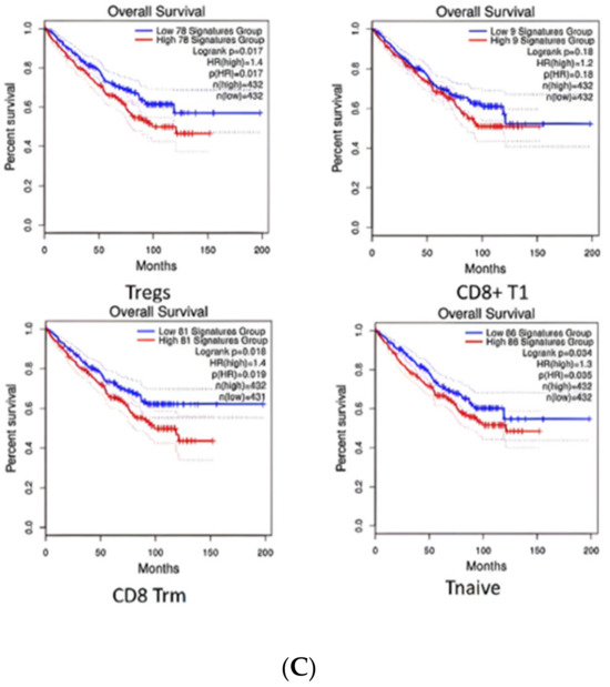 According to their gene expression characteristics, three types of T cells were identified: resident memory CD8+ T cells (CD8 Trm), naive T cells (T naive), and regulatory T cells (T regs) (Figure S4). As a major immunosuppressive subset of CD4+ T cells, Treg cells have been found to substantially infiltrate many solid tumors [45,46]. A high frequency of Treg cells is primarily associated with worse clinical outcomes in many kinds of tumors, such as melanoma, breast, lung, cervical, gastric, renal, endometrial, and ovarian cancers [47,48,49]. Therefore, we considered the main characteristic genes of Treg cells and CD4 + T cells—IL2, CD25, IL10, TGF-β, IL35, and FOXp3—taking these into account as candidate genes during the next step of selecting TFs.